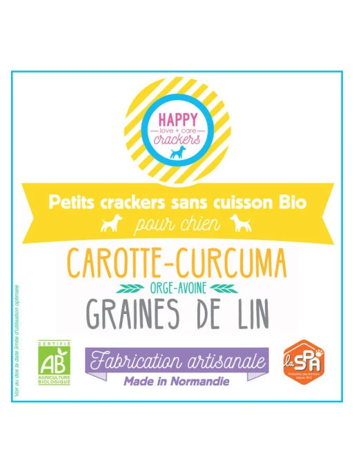 Pour le ru00e9compenser dans son apprentissage ou tout simplement pour lui faire plaisir, optez pour les biscuits u00e0 la carotte et au curcuma pour chien Happy Crackers qui sont des friandises bio conu00e7us avec des ingru00e9dients sains.