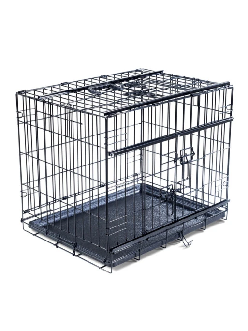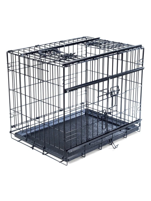 Cette cage pliable est munie de 2 portes d’accu00e8s coulissantes, l’un latu00e9rale et l’autre est situu00e9e sur le haut de la cage, chacune u00e9quipu00e9 d’un loquet.
