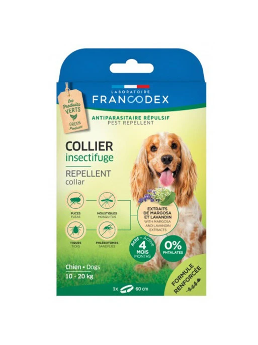 Sans PVC, sans phtalates et formulu00e9 u00e0 base du2019extraits de margosa et de lavandin, le collier insectifuge Francodex protu00e8ge votre chien pendant 4 mois des infestations parasitaires. Collier de 60cm.
