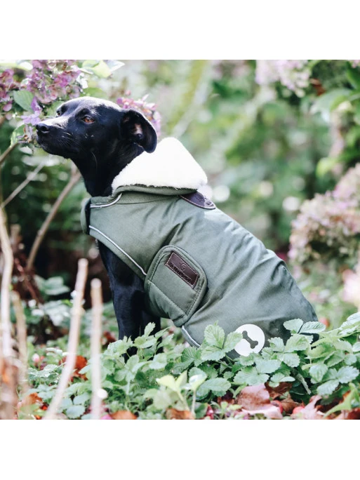 Un élastique est présent pour ajuster au mieux la couverture. Enfin, le passepoil et le logo sont en tissu réfléchissant pour que le chien soit visible, même de nuit. Le manteau se ferme grâce à un velcro sur le poitrail et sur le ventre.