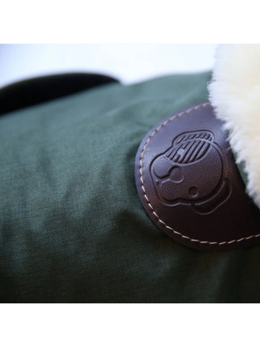 Le manteau possu00e8de une capuche en mouton artificiel pour u00e9viter tout passage d’air. Cette capuche peut u00eatre pliu00e9e pour du00e9gager le cou. Sous la capuche, recouvert par un rabat en faux cuir, se trouve une fente qui permet d’attacher facilement le chien en laissant passer une laisse.