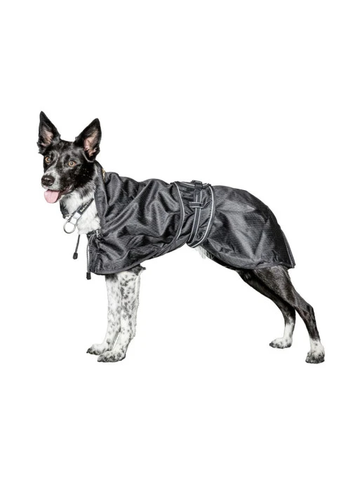 Cette couverture est ru00e9glable au niveau du poitrail et du cou pour un ajustement parfait u00e0 la morphologie de votre chien de sorte u00e0 le protu00e9ger au maximum lors de vos balades pluvieuses.