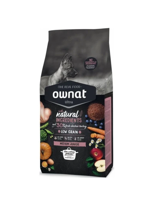 Offrant tous les apports u00e9nergu00e9tiques requis au bon du00e9veloppement des muscles, les croquettes Ultra Medium Junior Ownat sont u00e9laboru00e9es pour les chiots du sevrage jusqu’en fin de croissance.