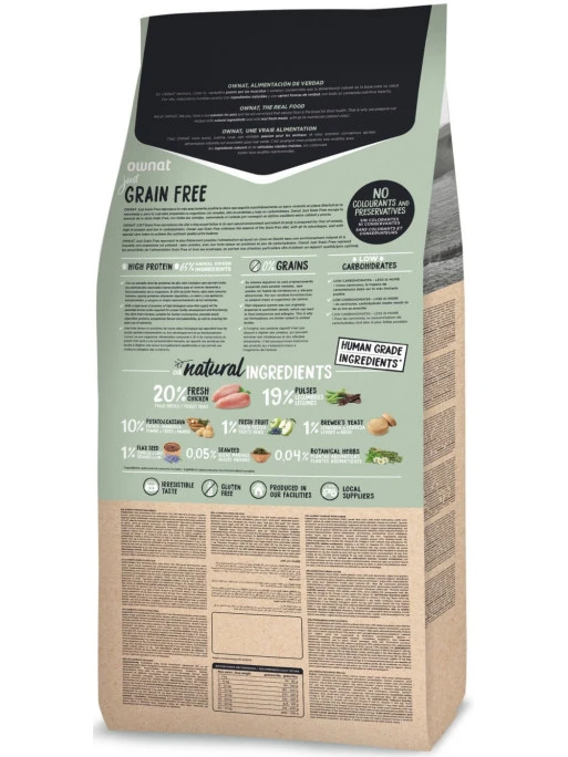 Les croquettes Just Grain Free Adult Chicken Ownat sont pru00e9paru00e9es avec 20% de viande frau00eeche de poulet minimum, ce qui en fait un aliment complet, tru00e8s appru00e9ciu00e9es des chiens gru00e2ce u00e0 sa grande appu00e9tence.