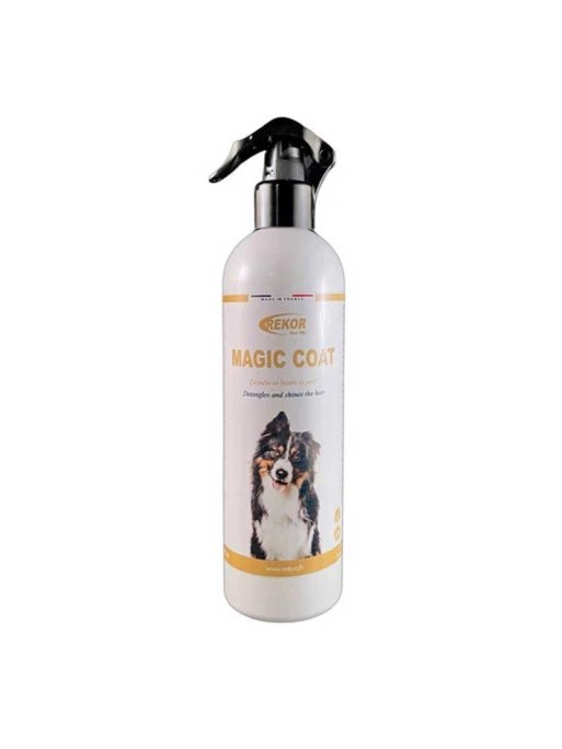 Enrichi en silicone, le du00e9mu00ealant lustrant Magic Coat 250ml Rekor facilite le du00e9mu00ealage et vient gainer le poil de la robe en lui assurant un aspect soyeux et brillant u00e0 effet longue duru00e9e.