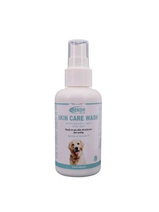 Exeru00e7ant une action du00e9sinfectante et nettoyante, le du00e9sinfectant Skin-Care Wash 125ml Rekor permet de du00e9contaminer quasi-instantanu00e9ment les plaies sur la peau de votre chien et ne nu00e9cessite pas d’u00eatre rincu00e9.