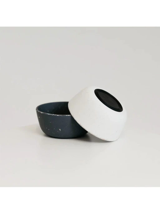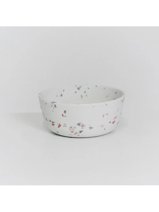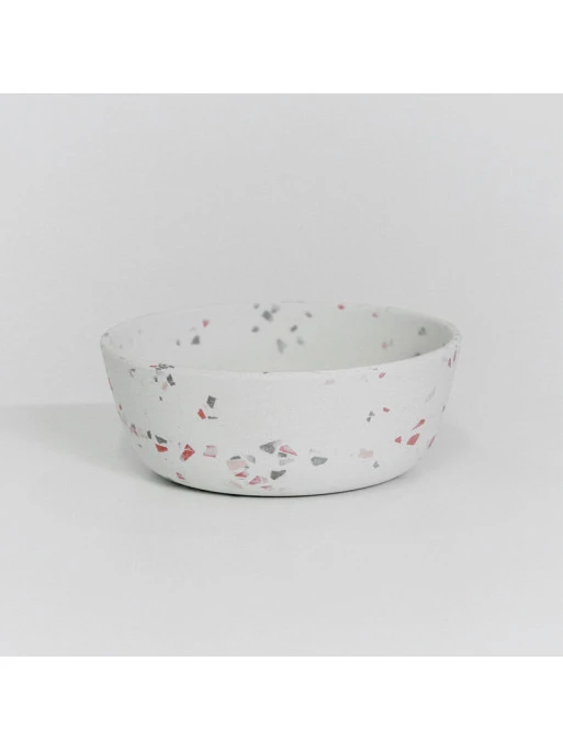 Cette gamelle est entièrement faite de bambou avec incrustation d’éclat véritables de pierres délicatement colorées qui lui confère un magnifique design terrazzo .