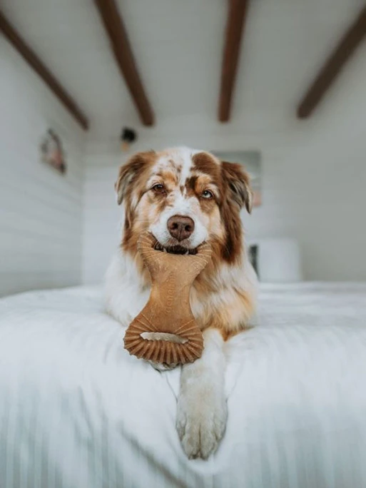 Grâce à ses extrémités crantées, le jouet à mâcher Dental Chew Benebone stimule les gencives et nettoie en profondeur les dents, luttant ainsi contre le tartre