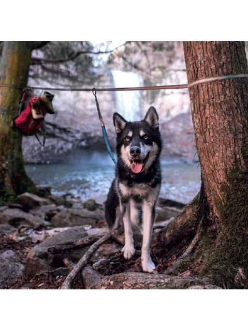 La sangle est plate, pour u00e9viter du2019abu00eemer lu2019u00e9corce des arbres, contrairement u00e0 une corde ronde. La laisse du chien se fixe u00e0 une sangle additionnelle u00e9lastique qui coulisse le long de la sangle principale, telle une tyrolienne, pour permettre au chien une plus grande amplitude de du00e9placements.