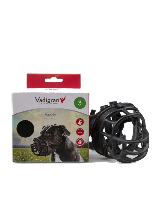 Avec son ouverture large et sa bretelle supplu00e9mentaire, la museliu00e8re caoutchouc Vadigran a u00e9tu00e9 conu00e7ue pour un port confortable et permet au chien de pouvoir haleter et boire.