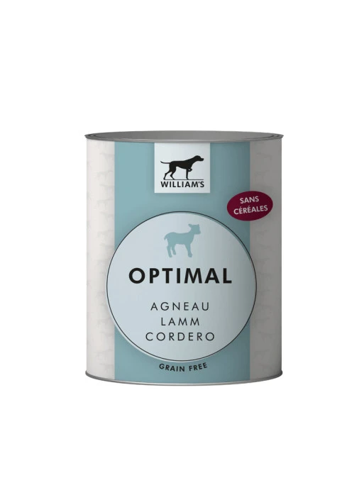 Cet aliment humide pour chien Optimal u00e0 l’agneau convient u00e0 tous u00e2ges et toutes races, composu00e9 d’ingru00e9dients de premiu00e8re qualitu00e9, riche en protu00e9ines, pauvre en glucides et sans cu00e9ru00e9ales.