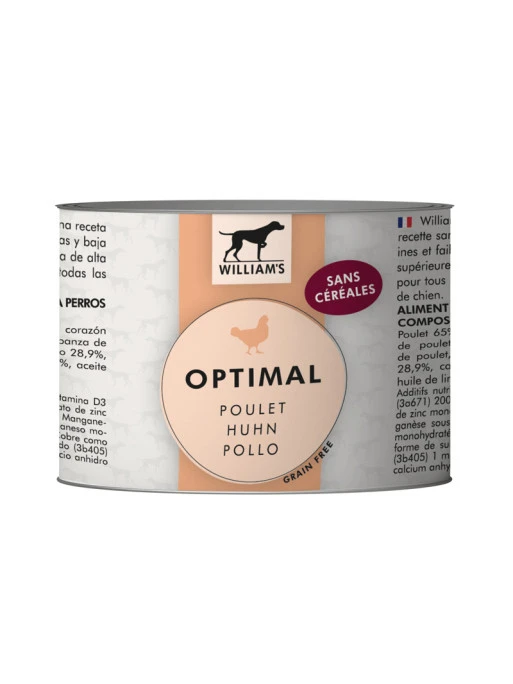 Cet aliment humide pour chien Optimal au poulet convient u00e0 tous u00e2ges et toutes races, composu00e9 d’ingru00e9dients de premiu00e8re qualitu00e9, riche en protu00e9ines, pauvre en glucides et sans cu00e9ru00e9ales.