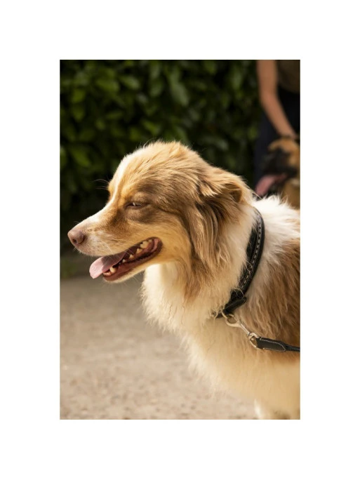 Doté d’une doublure pour le confort et d’une décoration très chic (Point Sellier), ce collier en cuir est idéal pour assortir votre chien à vos accessoires d’équitation des collections Pénélope Leprévost.
