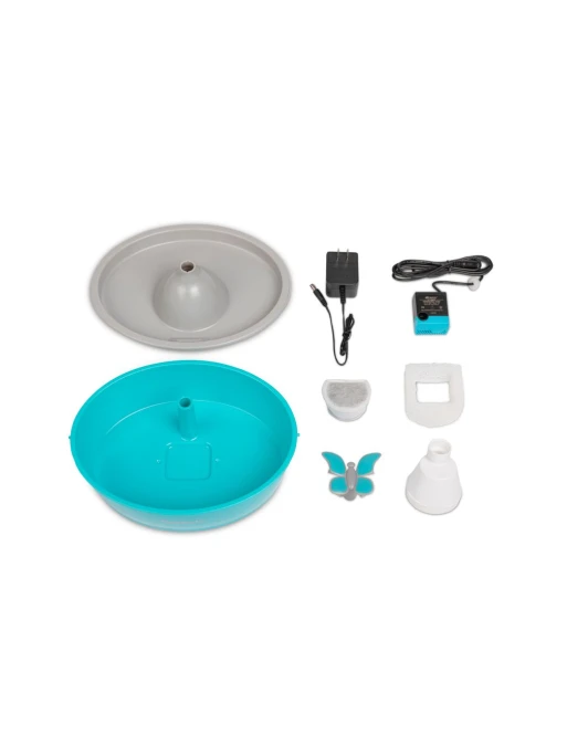 Le papillon en option sur le dessus, produit quatre flux à écoulement libre et peut se retirer pour créer un flux silencieux et effervescent. La fontaine Butterfly a été spécialement fabriquée sans cavités difficiles d’accès pour le nettoyage, le plastique utilisé est certifié sans Bisphénol A pour garantir la sécurité des animaux. La fontaine est équipée d’une double filtration : le filtre en mousse capture les poils et autre saletés pour une eau plus pure ; le filtre au charbon actif élimine les mauvais goûts et les mauvaises odeurs.