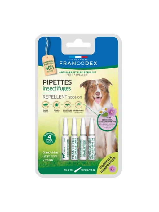 Afin de protu00e9ger votre chien des potentielles infestations de parasites, optez pour les pipettes insectifuge formule renforcu00e9e pour grand chien x4 Francodex, un anti-parasitaire qui convient aux chiens de plus de 20kg.