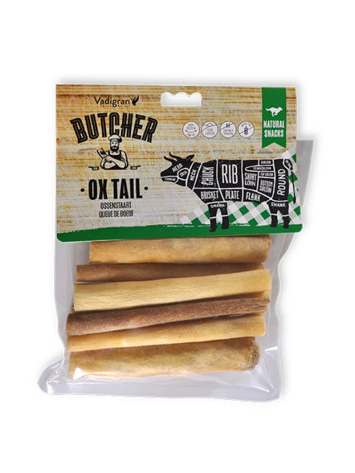 Parfaite pour subvenir au besoin de mastication quotidien de votre chien, la friandise queue de bu0153uf Butcher 215g Vadigran est aussi du00e9licieuse que saine