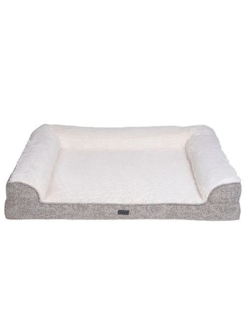 Le sofa lit Alys Beige/Blanc de Vadigran est un couchage pour votre chien en forme de canapu00e9 avec un intu00e9rieur en mousse u00e0 mu00e9moire de forme et un dessus en fausse fourrure ultra douce.